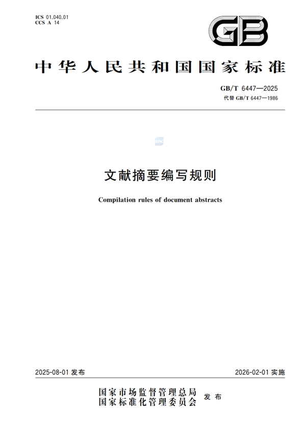 近日,国家标准《文献摘要编写规则》(GB T 6447—2025)经国家市场监督管理总局、国家标准化管理委员会批准正式发布,将于2026年2月1日起